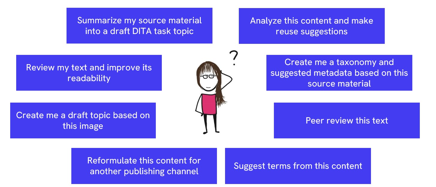 Let’s begin by discussing the evaluation of AI for enterprise use. The use and “brand” of AI must be approved by parties such as upper management, IT and cybersecurity, and the legal department. When technical communicators start using AI, the AI itself should already have been evaluated against the enterprise requirements, and it should have met them.